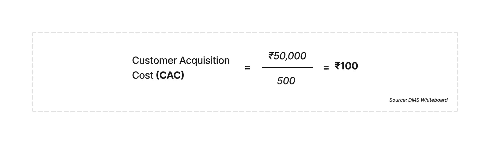 Let’s consider, that a SaaS company spends about ₹50,000 on marketing and sales in a month and is able to acquire 500 new customers. Their CAC would be evaluated as follow –